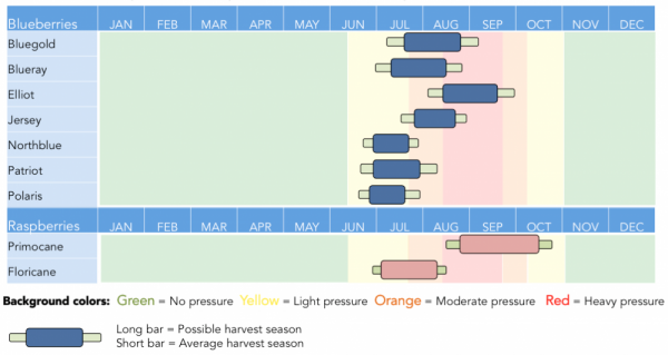 Figure 6. SWD presence and severity, along with common fruiting windows of several blueberry and raspberry cultivars in the Upper Midwest. Figure by Andrew Petran.
